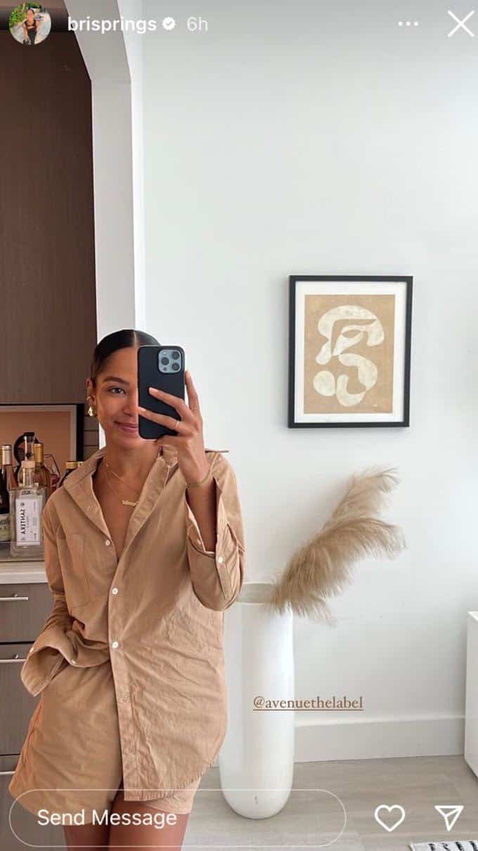 Bri struck a pose in an oversized camel-colored collared shirt with buttons down the middle. She paired the shirt with matching shorts as she placed one hand in her pocket and smiled for the photo.
