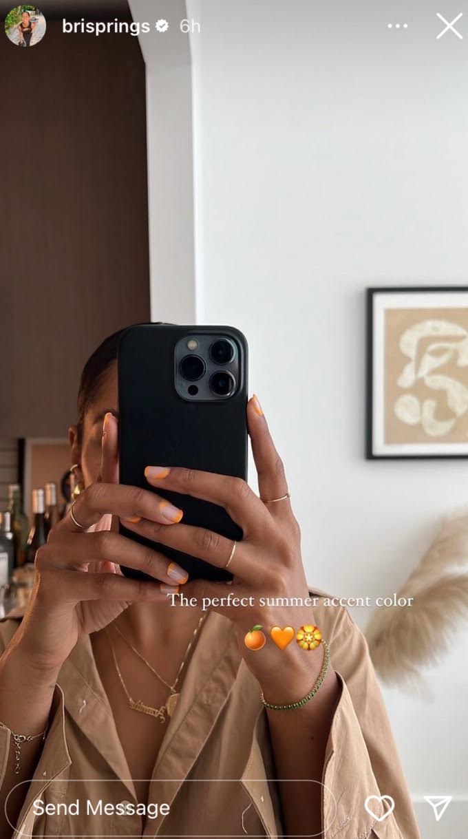 Covering her face with her phone, Bri put her nails center stage to reveal orange tips and bottoms on a neutral nail for a nice and colorful summer design.